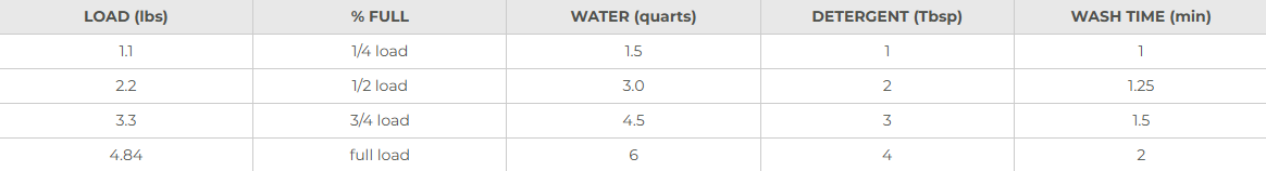 3. Determine the correct amount of detergent and water to use by checking the chart below. Add water and soap to the washing drum.